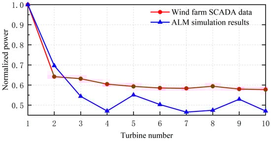 The calculation results of the ALM power are compared with the SCADA data of the wind farm, and the curves are shown in Figure 12. The SCADA data show that the power of the wind turbines from the 2nd to the 5th unit decreases one by one, and the power of the back row wind turbines is no longer decreasing and basically remains stable. The ALM successfully simulates the decreasing trend of the power of the back row wind turbines of the tandem wind turbines in the wind farm, but among them, the 5th and the 9th wind turbines have an increase in power compared to the previous one because of the sufficient turbulence in the wake stream and the exchange of kinetic energy. Following kinetic energy exchange, the wind speed has recovered, and the power has increased compared to the previous unit. Except for the first two wind turbines, the ALM simulated power output of the back-row wind turbines is overall lower than the measured data published by the wind farm, and the maximum deviation of power between the two is 11.9%, which occurs in the 8th turbine. Since the SCADA data are the averaged results over a period of time and the actuator line is difficult to accurately restore, the control law of the unit itself in the transient simulation leads to a certain degree of error in the calculation of the power coefficient Cp by the ALM. Considering that the power of the wind turbine is proportional to the cubic of the wind speed, it is still enough to consider that the ALM simulation of ten wind turbines established in this paper has high accuracy.