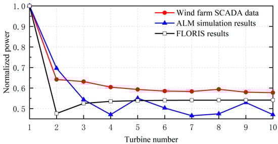 Figure 13 shows the normalized power calculated by FLORIS, and it is observed that although the error of the second wind turbine reaches 16.56%, it can correctly simulate the trend of decreasing power of the tandem arrangement wind turbines. FLORIS calculates a total power of 4798.354 kW from the SCADA measurement, which is 15.56% off. Relevant studies have shown that due to the existence of more idealistic assumptions and empirical parameters in the derivation of the wake model, the recovery of the wake will be underestimated in the process of practical application, resulting in high results of the calculation of the wake loss []. The comprehensive comparison shows that the engineering wake model is lower than the ALM in the accuracy of wind farm total power prediction, and the use of ALM for correction has guiding significance.