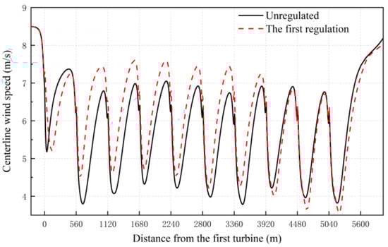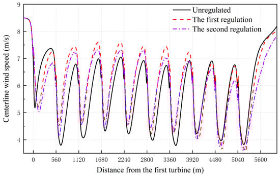By extracting the wake velocity at the centerline of the contour map, shown in Figure 15, it can be found that before the implementation of the wake regulation, the inlet wind speed of the third wind turbine is lower than that of the second wind turbine, then increases slightly, then decreases in the 6th and 7th wind turbines, and then the inlet wind speed in front of the 8th wind turbine increases slightly. After the implementation of the active yaw control strategy, the incoming wind speed in front of the 3rd~8th wind turbines increased significantly due to the wake deflection of the upstream wind turbines.