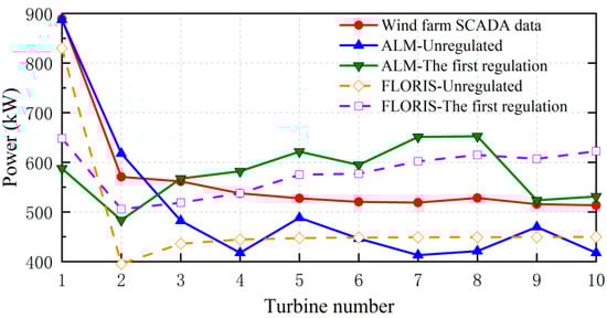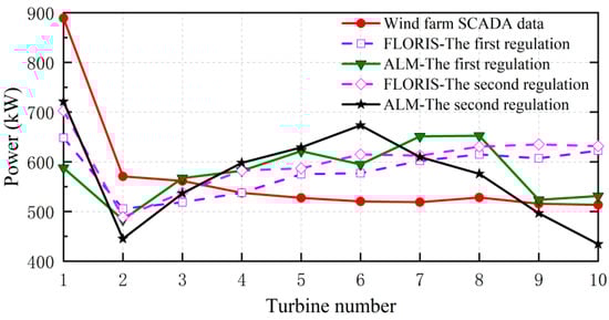 The most direct test criterion for the implementation of active wake regulation is the increase in wind turbine power. It can be intuitively observed from the curve shown in Figure 16 that the power of the rear wind turbine is greatly increased after the implementation of active wake control. After active yaw control, the total power of the ten wind turbines was 5808.97 kW, which was 21.06% higher than that before the regulation. According to the calculation results of the ALM, the total power is 5794.65 kW, which is 14.49% higher than that before regulation.
