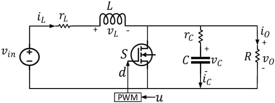 The boost converter topology shown in Figure 1 consists of the input source which is transformed into output voltage . The high-frequency operation of the switch induces ripples in both the output voltage and inductor current. The ESR pertains to the output filter capacitor C, while ESR is associated with the inductor L.