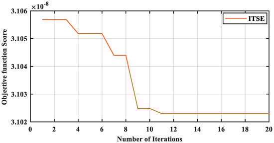 The best value of the objective function (18) is taken after 20 simulation runs. The mean optimal value of is taken after 20 runs of the simulation by considering (18) as an objective function. The best score obtained of the objective function is , and the mean value of the best solution obtained, i.e., the best position is . The convergence graph of the GWO method is shown in Figure 5.