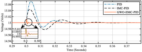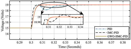 The parameters of the PID controller are taken from [24], and the IMC-PID parameters of the boost converter are calculated from the standard procedure given by (6)–(8). The parameters of the three controllers, namely PID, IMC-PID, and GWO-IIMC-PID controllers, are given in Table 3.