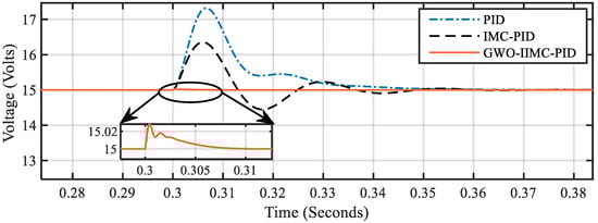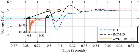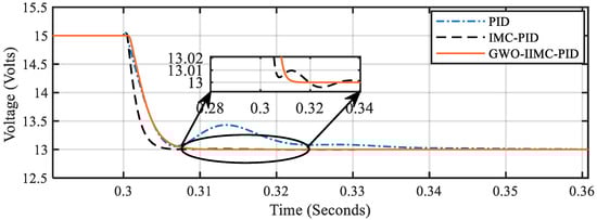 In the above two cases of input voltage change under a regulatory response, it is evident that the settling time of the IMC-PID and PID controllers are the same. Deviation from the setpoint voltage is more significant in the PID controller’s response whereas GWO-IIMC-PID shows a comparative faster tracking and less deviated response from the setpoint voltage as compared to the other two controllers.