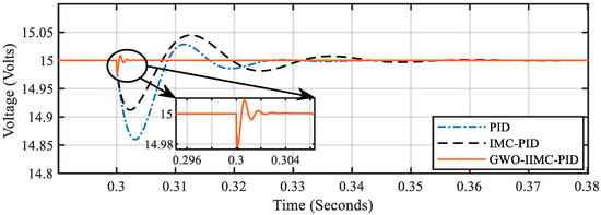 During the load change, the setpoint voltage and the input voltage remain at 15 volt and 10 volt respectively. The GWO-IIMC-PID controller rejects the load disturbance in a quick time with small oscillations.