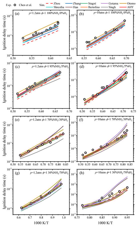 The IDTs for each ammonia/hydrogen mechanism were derived at p = 1.2 atm and 10 atm with ϕ = 1 and 0–70% H2, and the calculated results and the experimental data of Chen et al. [29] are shown in Figure 1.