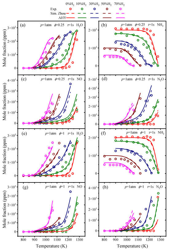 The molar fractions of H2O, NH3, NO, and N2O under various temperatures for ϕ = 0.25 and 1 and different H2 contents were simulated using each ammonia/hydrogen mechanism, where the residence time was 1 s and p = 1 atm. The simulated results are shown in Figure 2 and Figures S1–S8 in the Supplementary Material, compared with the experimental values from Zhang et al. [10].