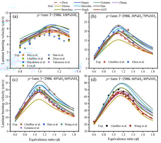 The laminar burning velocity of ammonia/hydrogen fuel was modeled at different equivalence ratios using various ammonia/hydrogen reaction mechanisms with H2 fractions from 0% to 60% under conditions of 298 K and 1 atm. The simulation results are compared with experimental data [13,15,30,31,32,33,34,35,36,37], as shown in Figure 3.