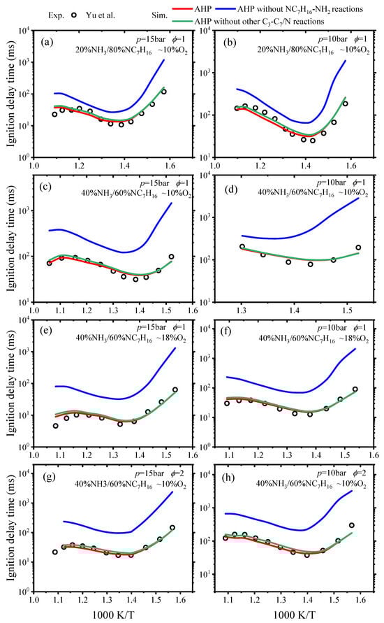 The IDTs of NH3/nC7H16 fuel were simulated using the AHP reaction mechanism under 20–40% NH3, ϕ = 1 and 2, and O2 concentrations of 10–18%, p = 10 and 15 bar. The simulated results were compared to the corresponding experimental values from Yu et al. [21], as illustrated in Figure 4.