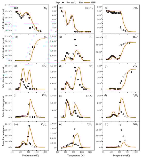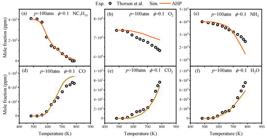 In the oxidation process, Thorsen et al. [23] conducted oxidation experiments on NH3/nC7H16 at 100 atm. In experiments conducted by Pan et al. [24] at atmospheric pressure, the NH3/nC7H16 mixture consisted of 0.5% NH3, 0.5% nC7H16, 87.25% Ar, and 11.75% O2. Comparisons of predicted component concentrations from the AHP mechanism with experimental values from Thorsen et al. [23] and Pan et al. [24] are illustrated in Figure 5 and Figure 6.