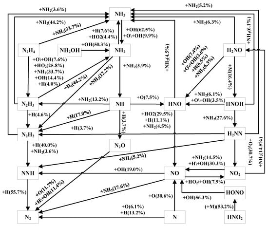 In order to gain further insight into the impact of varying fuel blends on ammonia, this study examined reaction pathways when the ammonia consumption reaches 20%. The specific conditions were p = 40 atm, ϕ = 1, 0% and 30% H2, and T = 1400 K. The result is shown in Figure 7 and Figures S9–S11 in the Supplementary Material.