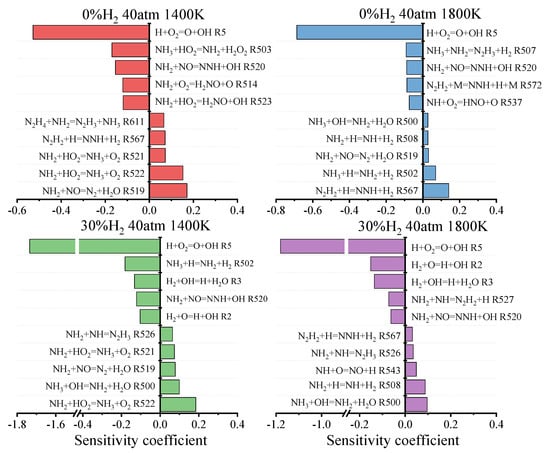 To further investigate the AHY mechanism, the IDTs sensitivity analyses of the AHY mechanism were performed at different ammonia concentrations and temperatures. The simulation conditions were set at p = 40 atm, ϕ = 1, with an H2 fraction of 0% and 30%, and T = 1400–1800 K. The result is illustrated in Figure 8 and Figure S12.