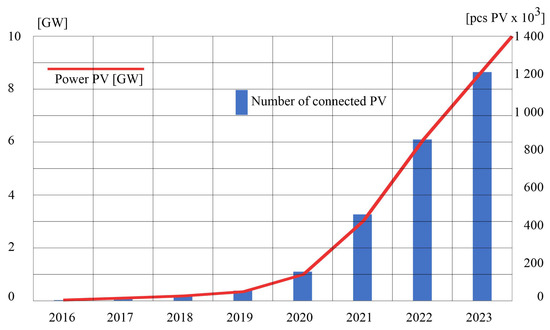 Based on the report from the Polish Society for the Transmission and Distribution of Electricity (PTPiREE) entitled “Micro-installations in Distribution Networks in Numbers—state as of the end of May 2023”, Figure 1 illustrates the growth dynamics of the number and capacity of micro-installations connected to distribution networks. These data are crucial for understanding the trends and challenges associated with the development of micro-installations and their impact on distribution networks in Poland.