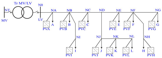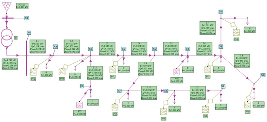 The analysis of the impact of energy introduced by prosumer photovoltaic installations on energy losses in a low-voltage line was carried out based on measurement data from a real network operating in southern Poland, constituting part of the national DN. The analysed low-voltage network is shown in Figure 2.