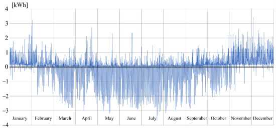 The analysis presented in this paper assumes the installation of 3-phase inverters that ensure symmetrical current generation in each phase (thus eliminating additional losses due to generation asymmetry). The capacity of each installation is tailored to the annual electricity consumption of a given consumer to ensure that the annual energy production from the photovoltaic panels exceeds the annual energy demand of the respective consumer by 20%. Figure 3 shows the difference between the energy consumed and the energy produced by the PVC photovoltaic installation for prosumer C at specific hours of the year, expressed in kWh.