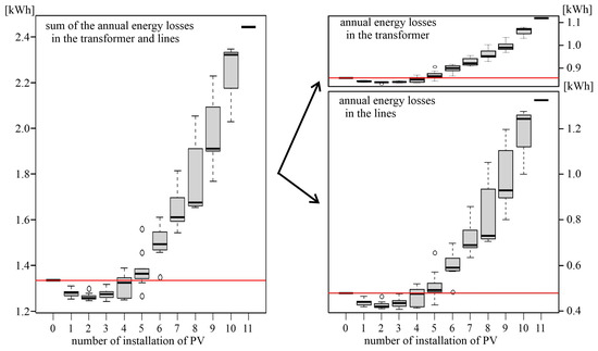 Total energy losses in the line and transformer (left part of the figure), energy losses in the transformer itself (right-upper part of the figure), and total energy losses in the lines (right-bottom part of the figure) depending on the number and on the placement of PV installations in the line. The red line indicates the relative level of energy loss without active PV generation.