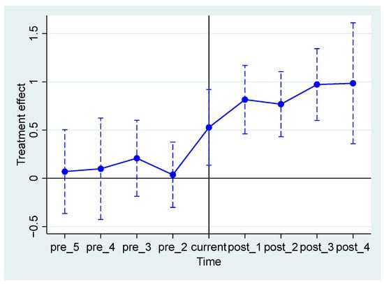 where i represents the enterprise, t stands for the year, lnEP stands for corporate environmental performance, and Treat is a group dummy variable, which takes 1 if the enterprise is in the heavy pollution industry and 0 otherwise. Post is a time dummy variable that takes 1 for the period after the policy was officially implemented (after 2017) and 0 before. Control represents a set of control variables; μt represents time fixed effects; εit represents the random disturbance term; and α1 is a differential coefficient to measure the impact of green finance policy implementation on the environmental performance of enterprises in the experimental group.