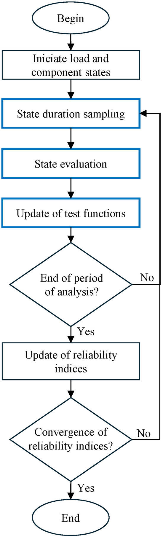 - If at least one component is in the failure state, power flow evaluations can be performed assuming standard dispatch profiles and control settings. In case the power flow solution corresponds to an operation point without violating system constraints, the system state can also be considered successful, meaning that load curtailments are not needed, and events of a loss of load are not expected. Otherwise, optimization problems must be solved aiming to verify and quantify the occurrence of load curtailments and corresponding remedial actions.