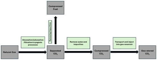 The concept of Carbon Capture and Storage (CCS) was first introduced in 1977 when CO2 emitted from a coal power plant was captured and injected into a suitable subsurface geological formation [9]. These suitable formations for CO2 injection include saline aquifers, coal beds, and depleted oil and gas reservoirs [10]. Currently, anthropogenic CO2 can be captured and geologically stored from activities such as electricity generation and industrial processes, including hydrogen production [11]. An example of this process is shown in Figure 1, where CO2 with a high content is extracted from natural gas and injected into an underground formation. The sequestration of CO2 in the subsurface can also take place through the Enhanced Oil Recovery (EOR) method, which makes this technique a multifaceted process because while CO2 is captured in underground geological formations, oil production will increase [12,13]. This approach can help in removing CO2 from the atmosphere while also enhancing energy production. In this technique, the CO2 is captured from the emission source and is injected into the mature oil field. When injected into the reservoir, the CO2 will act as a solvent and reduce the oil’s viscosity, increasing its mobility. At the same time, it helps to increase the pressure of the reservoir and improve production. Nonetheless, the impact of CCS-EOR is debatable when it comes to the long-term strategies of climate change. Critics argue that in one place, the CO2 in the atmosphere is removed by the sequestration process, while on the other hand, the increase in fossil fuel production will further delay the shift toward renewable energy, which can help to reduce greenhouse gas emissions in the environment.