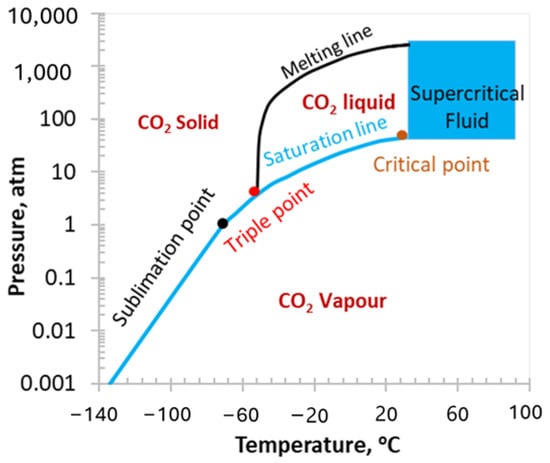 When the pressure and temperature of the CO2 go above the critical point (7.37 MPa and 31 °C), the state of the CO2 changes to the supercritical phase [29]. At this point, CO2 has the viscosity of gas and density of liquid. Therefore, when the CO2 is pumped into the subsurface, the pressure and temperature of the bottom hole convert the injected CO2 into the supercritical phase, due to which its diffusivity and reactivity increase and become more severe than any other CO2 phase. The phase diagram of CO2 is illustrated in Figure 2.