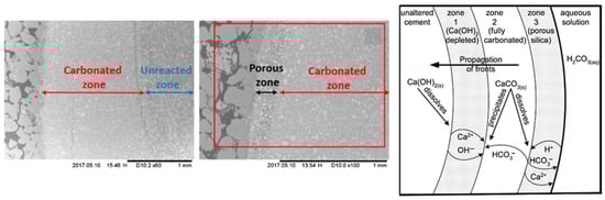 At this stage, the cement will lose its integrity, leading to increased porosity and permeability, while its mechanical strength is compromised. This increase in transfer properties occurs because the molar volume of CaCO3 is smaller than that of C-S-H (calcium silicate hydrate). As CaCO3 replaces C-S-H, more voids are created within the cement matrix, contributing to the deterioration of its transfer properties [32]. While the primary cause of the reduction in the mechanical properties of the cement is the formation of amorphous silica gel [17,30]. Figure 3 illustrates various chemically altered zones identified after the carbonation test, as reported by [17,33].