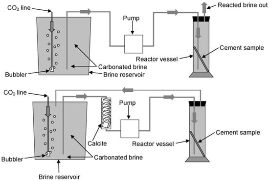 Carbonation setup used by the studies carried out by Duguid and Scherer [34]. Upper section represents the sandstone reservoir condition, while lower part corresponds to the limestone reservoir condition.