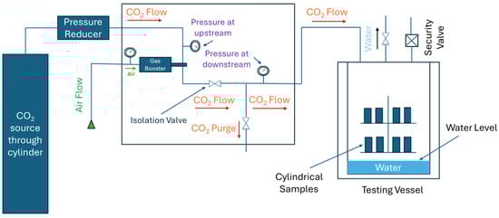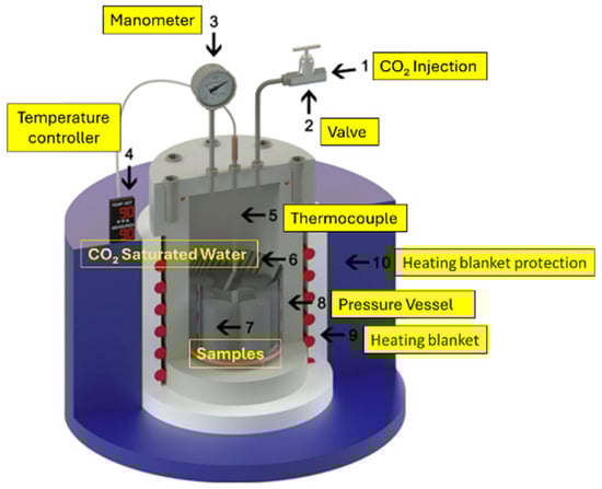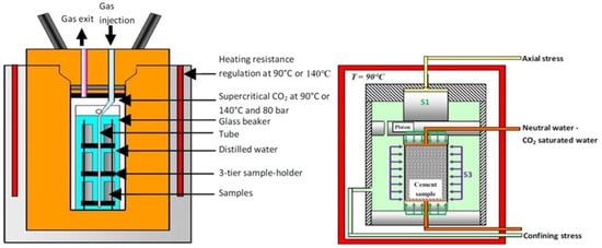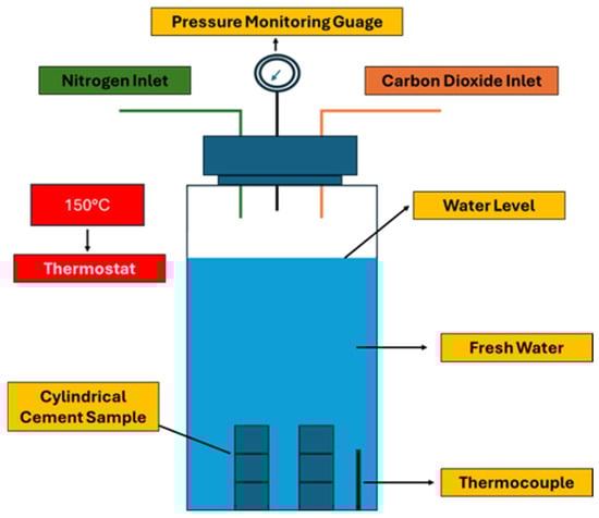 Laudet, et al. [37] conducted the carbonation test on the Class G and Class G + 35% Silica Flour (SF). They utilized two methods of testing: one static and the second one dynamic. In the static test, the samples were placed in the static reactor without any confining pressure. In the dynamic testing, they used coupled chemomechanical techniques, where the specimen was subjected to the CO2 environment while simultaneously being exposed to triaxial stresses. Although the second test is referred to as a dynamic test, but both tests were conducted in static reactors. The curing conditions for the samples varied depending on the experiment. For both the static and dynamic tests involving Class G cement, the samples were cured for more than 28 days at 90 °C. The SF cement composite was cured by exposing the samples to 140 °C and 20.7 MPa for the first ten days. Afterward, the samples were placed at atmospheric pressure and temperature of 90 °C (for the carbonation test at 140 °C). They wanted to replicate the condition for Class G + 35% SF in which the cement sheath is rapidly exposed to the CO2 environment. Cylindrical samples were used for the static (20 mm × 40 mm) and dynamic (25 mm × 50 mm) tests. The experimental setup in which the carbonation test was conducted is shown in Figure 5. The samples were immersed completely in the water present in the static reactor and were subjected to the pressure of 8 MPa and temperature of 140 or 90 °C (depending on the testing condition). The dynamic test lasted for 12 days, while the static test extended up to 88 days. After the testing period, it was reported that the neat sample and Class G incorporating 35% SF went through partial or full carbonation. However, the reaction rate for the neat Class G cement was controlled by diffusion, which evolved linearly with the square root of time. In contrast, for the SF cement composite, the progression of the carbonation front was constrained by reaction kinetics, with the carbonation front advancing linearly over time. Moreover, the dynamic test, designed to study chemomechanical effects, revealed that the cement was able to maintain its integrity and preserve its transfer properties. They concluded that in a CO2-rich environment, the cement’s integrity is unlikely to be compromised by the reaction with CO2. Instead, integrity loss is more likely to result from factors such as brine lixiviation and mechanical-induced damage (micro annulus, hydro frac, etc.).