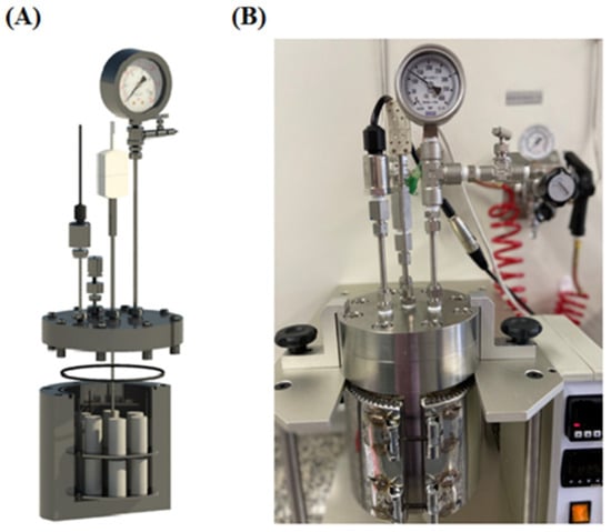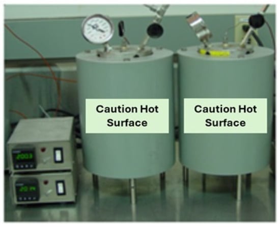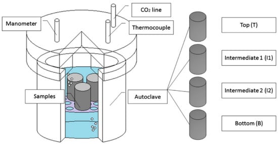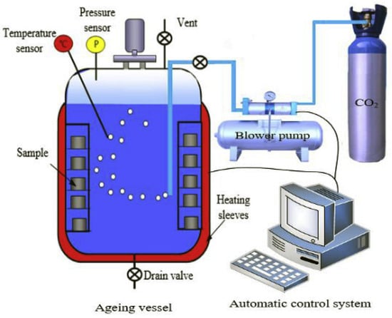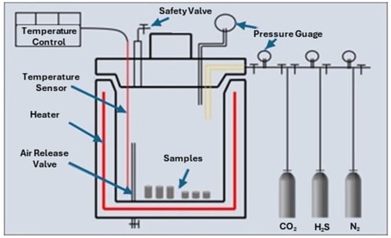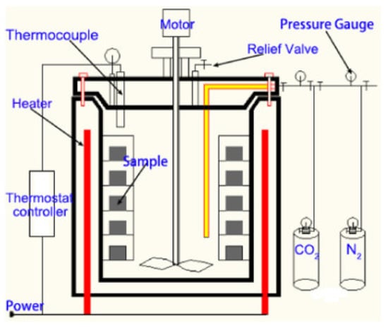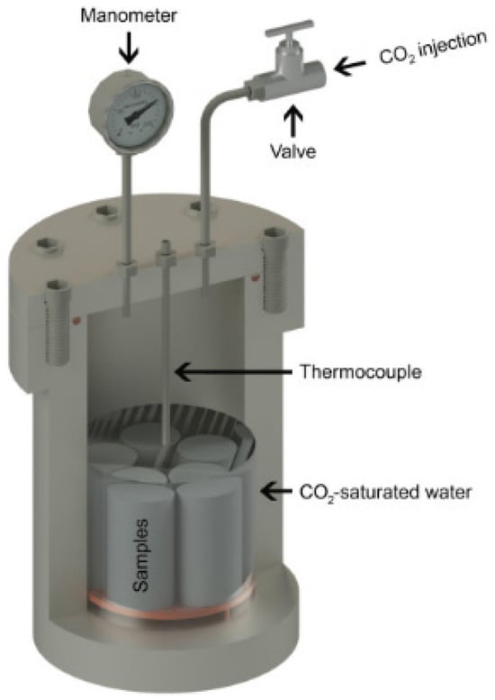 Costa et al. [43] did studies on the carbonation of Class G cement, which was based on sedimentation. In that respect, two slurries of Class G with two different additives were prepared. The first additive could maintain the element in suspension, resulting in a stable system, while the second additive caused particle suspension, leading to an unstable system. After the preparation of the slurry, it was placed in the cylindrical metal mold having the dimension of 203 mm height and 25 mm internal dia (ID) and was immersed in a water bath maintained at 70 °C and atmospheric pressure for a duration of 24 h. After curing for a day, the sample was cut into four equal parts with a 50 mm length. The specimens were then placed in CO2-saturated water in an autoclave (Figure 11) for 30 days at a temperature of 70 °C and a pressure of 13.8 MPa (2000 psi). The carbonated samples were then analyzed through the static sedimentation test, XRD, and acid-base indicator. It was noted that the carbonation of the cement behaves in a certain pattern when sedimentation of the particle occurs. The author named that pattern the hourglass effect. Therefore, a model based on fluid mechanics was proposed to describe the sedimentation and carbonation behavior of the unstable slurry. It was suggested that ensuring sedimentation stability is crucial for accurate carbonate cement studies; otherwise, sedimentation issues in the cement could lead to false negative or false positive results.