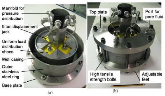 Well-bore test cell used by Syed et al. [39]. (a) Central mechanism of the testing chamber in which annulus is shown where the cement was poured in (b) Complete assembly of the wellbore cell.