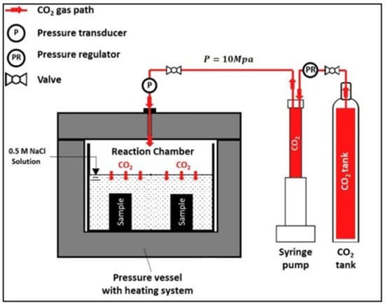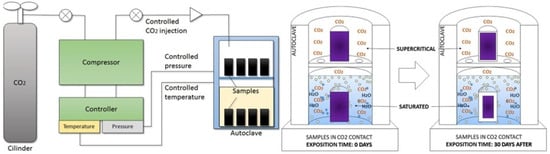 The interaction between carbon dioxide and cement begins when CO2 dissolves in the formation water, resulting in the formation of carbonic acid. The reaction is presented in Equation (7) [17,30].