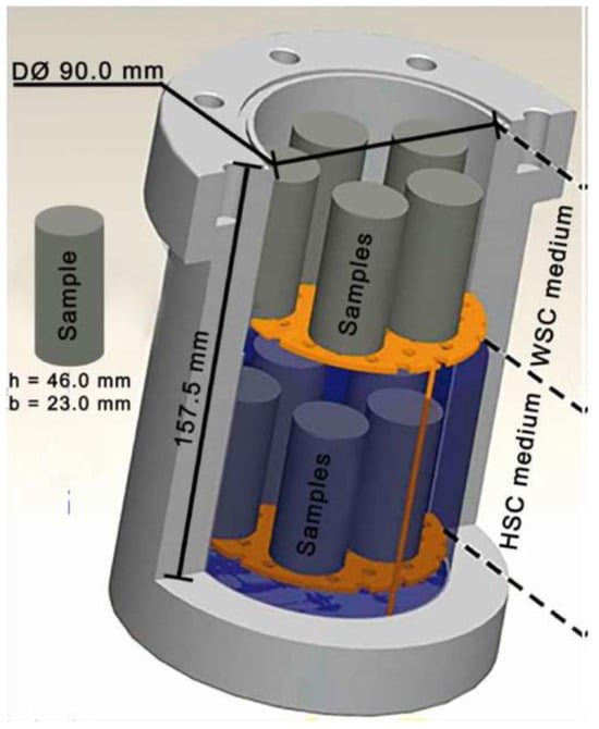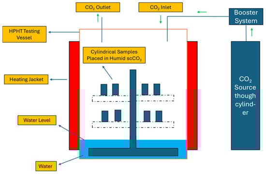 Santra and Sweatman [38] study showed that the reaction of cement with CO2 is inevitable due to the thermodynamically favorable conditions in the CCS environment. However, the effects of carbonation can be mitigated by incorporating various additives into the cement. In this respect, they conducted the carbonation test on Class G and Classified cement samples. The samples were first cured for 28 days in a water-filled pressure vessel at 13.8 MPa (2000 psi) and 60 °C (140°F) before being exposed to the carbonation test. The dimensions of the cylindrical samples were 63.5 × 25.4 mm (Dia × Height). After curing, the samples were placed in a static test cell (Figure 6) filled with fresh water and supercritical CO2, maintaining the same temperature and pressure as during the curing conditions (140 °F and 2000 psi). The first set of samples was subjected to exposure for 15 days, while the second set was exposed for 90 days. It was concluded from this study that the percentage of carbonation and its depth are dependent upon the portlandite produced during the cement hydration and W/C ratio. The modified cement performed better in the simulated CCS environment. The authors suggested that cement designed specifically for CCS wells must be capable of withstanding geomechanical stresses. They concluded that the ionic content of the formation fluid tends to increase the pH of carbonic acid, thereby reducing its corrosive effect on the cement sheath surrounding the well. Furthermore, they found that incorporating pozzolanic material into the cement could be advantageous, as it reduces the cement’s transfer properties. Alternatively, using non-Portland cement, such as resin-based cement or high alumina phosphate, could completely prevent cement carbonation since no Portlandite would be present in their composition.