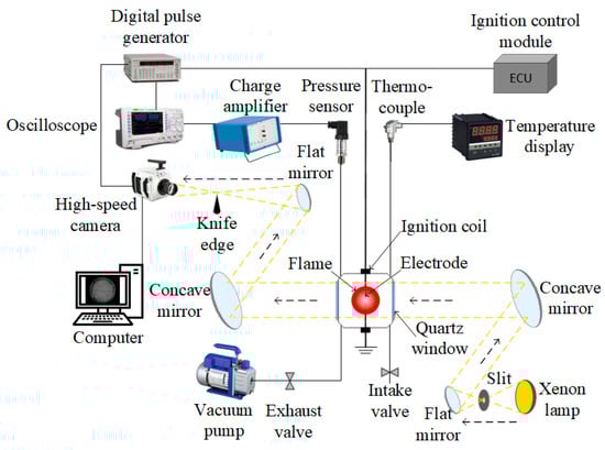 The experiments were conducted at initial pressures of 1–3 bar and an initial temperature of 358 K. The compressed air volume fractions of H2 added to the EA were 4%, 8%, and 12%, respectively. The H2/air volume fractions were measured using the mass flow meters (HORIBA METRON S500). Equations (1) and (2) show the stoichiometric combustion reactions for EA and H2, respectively.