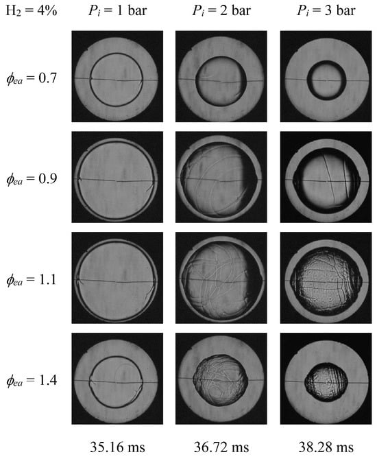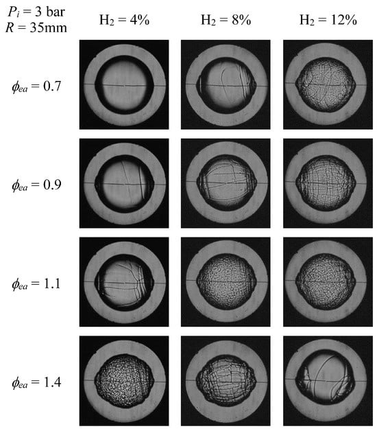 Figure 4 presents the EA with 4%, 8%, and 12% H2 fraction flame images at pi = 3 bar, ϕea = 0.7, 0.9, 1.1, and 1.4, and R = 35 mm. The proportion of H2 was found to accelerate cell production on the flame surface. Additionally, a reduction in the flame front’s strength of stretch resulted in decreased flame stability. Therefore, when ϕea increased at H2 = 4% and 8%, the stretching impact was feebler than the strength of the external flame curvature for the same radius, causing stronger flame instability. Otherwise, when ϕea increased at H2 = 12%, the thermal instability was weaker, causing weaker flame instability [32].