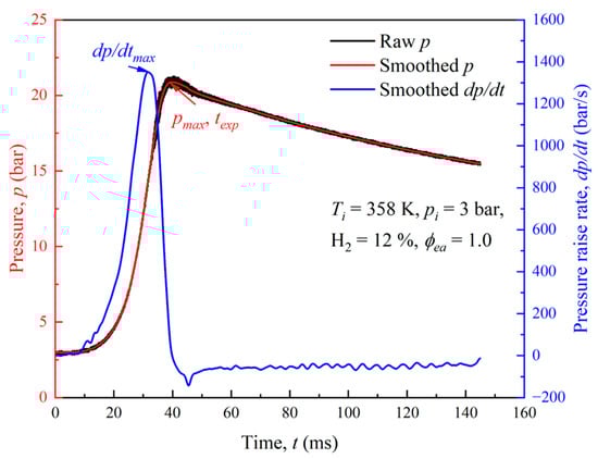 Figure 6 displays the curves of the raw explosion pressure, the smoothed explosion pressure, and the rate of pressure rise. The pressure of explosion rises rapidly after ignition, and there is a peak of pressure because of the contact with the wall of CVCC [46]. The smoothed curves can be filtered by Gaussian filtering in order to remove the interference present in the raw data, thereby allowing the trend in pressure and pressure rise rate to be more clearly reflected for the purposes of studying flame explosion characteristics. At the point at which the smoothed pressure curve reaches its maximum, the pressure at this point can be defined as the maximum explosion pressure pmax, and the time at this point can be defined as the explosion duration texp. Similarly, the pressure rise rate also rises rapidly after ignition and decreases when the flame reaches the wall of CVCC. The maximum value of the pressure rise rate is defined as (dp/dt)max.
