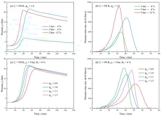 Figure 7 displays the curves of EA explosion pressure and pressure rise rate under various H2 fractions, initial pressures, and equivalence ratios. In line with Figure 7a,b, the explosion pressure reached its peak more rapidly with a rise in the initial pressure or a rise in the H2 fraction. The observed rapid increase in explosion pressure with a higher initial pressure or hydrogen fraction can be attributed to fundamental thermodynamic principles. An increase in initial pressure enhances the density of the reactant mixture, reducing the mean free path of reactive species and thereby accelerating reaction rates [47]. Similarly, the high diffusivity and reactivity of hydrogen contribute to more efficient radical formation, intensifying combustion and leading to higher peak pressures. This behavior aligns with the theoretical predictions of pressure rise dynamics in hydrogen-enriched fuel systems and underscores the critical role of initial conditions in controlling explosion severity. At a higher H2 fraction, the explosion was much faster and the peak was more similar to a lower fraction. This may be because of the high diffusivity and reactivity of H2 [29].