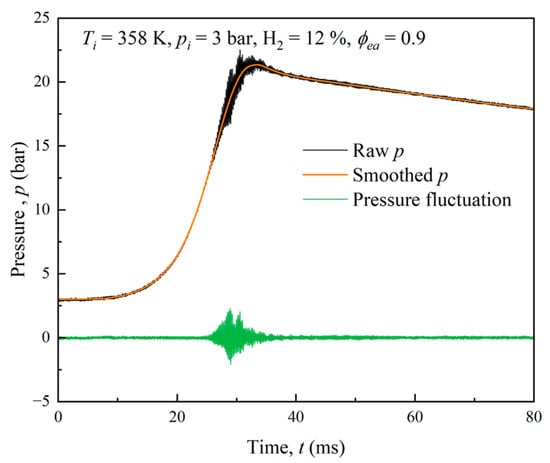 Figure 8 displays the curves of the pressure fluctuation, the smoothed explosion pressure, and the raw explosion pressure. The figure illustrates that the fluctuation of pressure was significant near the peak of the explosion pressure. The unburned mixture was compressed and the rate of heat release increased as the flame expanded, resulting in the pressure fluctuation. Due to unstable combustion, this fluctuation could promote unstable heat release [49].