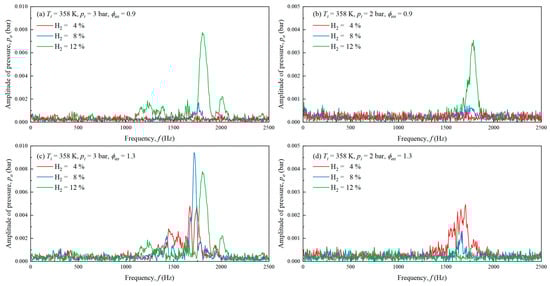 Using the Fast Fourier Transform (FFT) method, the pressure fluctuations could be analyzed by transforming them into frequency domain information. Figure 10 displays the spectrum analysis of pressure fluctuations under different initial pressures, equivalence ratios, and H2 fractions. It is evident that the pressure fluctuation consists of a specific frequency range and other disturbances.
