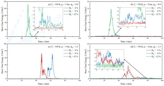 Figure 11 shows the short time energy analysis of pressure fluctuations under different H2 fractions, initial pressures, and equivalence ratios. It is evident that the STE distributions were similar to the pressure fluctuation distributions, and the STE increased quadratically relative to the pressure fluctuation due to the equation. The maximum STE increased as the speed of the unstable flame increased, as supported by the flame speed in previous research [32] and flame images. Consistent with the conclusions of Dubey et al. [51], the mixture’s high speed can easily cause acoustic parametric instability. Therefore, adjusting the H2 fraction and the equivalence ratio can reduce wrinkles on the flame front, decrease the flame instability, and ultimately reduce the energy loss and the explosion sound intensity.