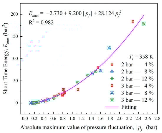 To quantify the complex nonlinear relationship between the pressure fluctuation amplitude and short time energy, Figure 12 displays the relationship between the maximum short time energy and the absolute maximum value of pressure fluctuation under various equivalence ratios, H2 fractions, and initial pressures. It is evident that the absolute maximum value of pressure fluctuation fits a quadratic polynomial relationship with the maximum short time energy, indicating a nonlinear dynamical coupling mechanism between them. The short time energy analysis provides valuable insights into estimating and optimizing the acoustic loss of gas mixture explosions. A more in-depth understanding calls for quantitative numerical simulations of the nonlinear dynamics.