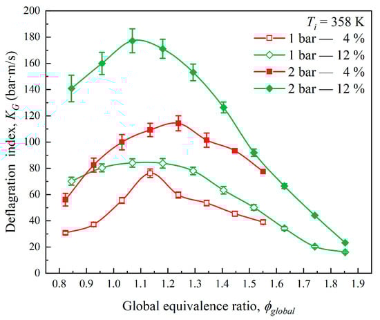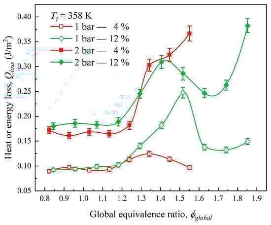 The total heat or energy loss (Qloss) during the limited explosion in the CVCC includes heat loss, gas expansion, and friction with the vessel wall. The heat loss in this section was obtained by Equation (15). Figure 19 shows the heat or energy loss under various global equivalence ratios, H2 fractions, and initial pressures. The Qloss curve showed a single peak within the experimental range. A high initial pressure led to a subsequent rise in rich mixtures, which could even cause the second peak. The lean mixtures exhibited a smooth Qloss, which was due to the gentle explosion and the low explosion energy. The peak appeared at around ϕglobal = 1.4, making the flame speed maximum and the explosion fluctuate. Then, the Qloss started to decrease because the incomplete reaction slowed the combustion. Due to the increasing deficiency of oxygen, the duration of the explosion is longer, which results in a subsequent rise in Qloss. With the initial pressure increases, the Qloss also increases, resulting in a longer explosion duration and lower flame speed [54]. The heat released during combustion increases as the initial pressure increases, resulting in greater heat loss. Increasing the H2 fraction makes the peak of Qloss more significant, and the peak appears later in the equivalence ratio. It has been observed that increasing the H2 fraction in oxygen-sufficient mixtures can significantly increase heat loss in rich mixtures.