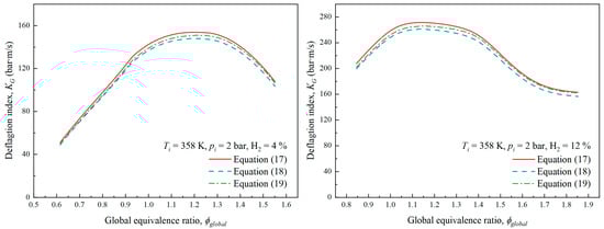 Also, the adiabatic deflagration index is obtained via the following three equations, proposed by Dahoe et al. [40] (Equation (17)), Van Den Bulck [41] (Equation (18)), and Luijten et al. [42] (Equations (19) and (20)).