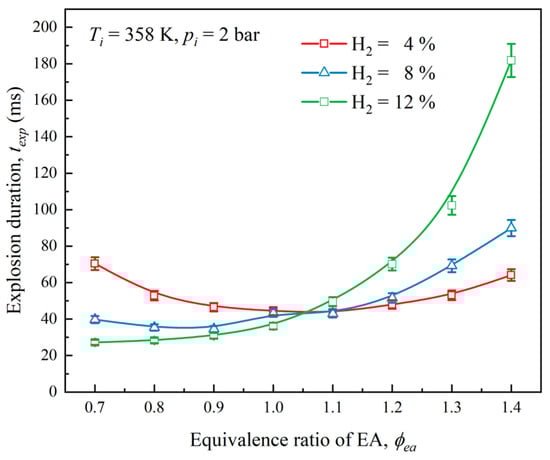 Hydrogen gas (H2) also shows a capability as a fuel and other related applications [9,10,11,12,13,14]. It can reduce fuel consumption and engine emissions when blended with hydrocarbon fuels [15,16,17]. The inclusion of H2 in a fuel mixture can significantly improve the explosion intensity, reactivity, and flammability limit of hydrocarbon fuels during combustion [14,18,19,20]. Therefore, the addition of hydrogen to hydrocarbons can raise the temperature and speed of the flame, thereby increasing the risk of explosion. Thus, it is necessary to examine the H2’s impact on the explosion and combustion tendencies of hydrocarbon biofuels like EA in various conditions to ensure safety.