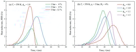Figure 17a illustrates that, due to the more severe reaction and higher mixture density, the increase in initial pressure results in a continued rise in HRR to higher peaks at a consistent rate [47]. Additionally, increasing the H2 fraction not only caused a higher maximum of HRR but also accelerated the peak of HRR because of the high reactivity and diffusivity of the mixture after adding H2 [29]. Figure 17b shows how the HRR changes with the equivalence ratio. It can be observed that the HRR of lean mixtures exhibits a faster and higher peak as the equivalence ratio increases. In contrast, for the rich mixtures, an increase in the equivalence ratio results in a slower but identical peak value for the HRR. This law of HRR change shows similarity with the law of change in flame speed.
