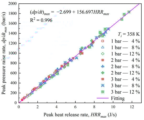 Figure 18 displays the maximum heat release rate for various initial pressures and H2 fractions at all equivalence ratios within the experimental range. Similar to Figure 17a, the total group of various initial pressures and H2 fractions increased with increasing initial pressure or H2 fraction. Additionally, Figure 18 displays the relationship between the maximum rate of pressure rise and the maximum heat released. The linear fit displays a great correlation with the experimental data. The calculated result is (dp/dt)max = −2.699 + 156.697HRRmax, which represents the maximum rise rate or heat release rate under certain initial conditions. The figure shows that the maximum pressure rise rate increases with the maximum heat release rate. This conclusion is consistent with the conclusions of Giurcan et al. [55] on the propane/air mixtures explosion characteristics and Oppong et al. [31] for methyl pentanoate/air mixtures.