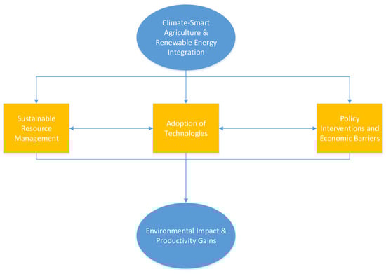 This conceptual framework, as shown in Figure 1, outlines the interlinked factors that will influence the adoption of climate-smart agriculture through AI and IoT with renewable energy. It contains, at the top, climate-smart agriculture and renewable energy integration, supported by three important pillars, namely: sustainable resource management for optimization of water, energy, and land use; adoption of technologies regarding scalability and accessibility in AI and IoT solutions for agriculture; and finally, policy interventions and economic barriers as a study of how government policies and economic incentives further or dampen the adoption of these kinds of innovations. It also explains how all these factors lead to environmental impact and productivity gains by stating that the components should help reduce greenhouse gas (GHG) emissions while improving efficiency and ensuring more sustainable farming practices.