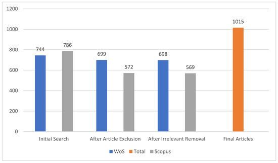 As shown in Figure 2, first of all, through the WoS database, we retrieved 744 records. Then, by applying a filter, excluding book chapters and conference papers, the amount became 699 articles. After removing one irrelevant article on religion, it reached 698 articles. On the other hand, the Scopus database returned an initial sum of 786 records. This was reduced to 572 articles once book chapters and conference papers had been excluded, and then three arts and humanities articles were removed, bringing the number to 569. After that, we removed the duplicates between the two databases, resulting in a total of 1015 unique articles to be analyzed.