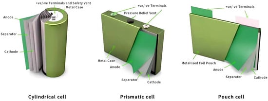 Li-ion battery form factors directly influence fit, manufacturing efficiency, and electrical behavior. In Figure 1, some available battery shapes are illustrated. Cylindrical cells, commonly used in electric vehicles, offer high energy density and good heat dissipation, but their rigid shape can limit the flexibility of battery pack design. Prismatic cells, on the other hand, due to their rectangular shape, can be stacked densely and offer better heat management, but have higher manufacturing costs and potential safety issues. Pouch cells, flexible and lightweight, fit into tight spaces and offer good energy density, but are more susceptible to mechanical damage and have less efficient heat dissipation. Table 3 shows the main aspects of each possible form factor for lithium-ion batteries.