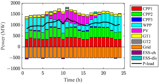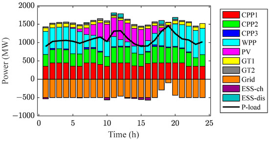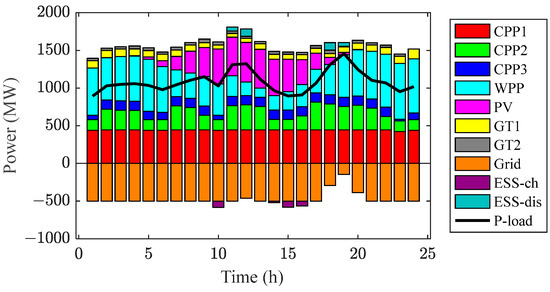 All computations are performed on a desktop computer equipped with an Intel i5-12400H 2.50GHz CPU and 32GB RAM, using Python 3.9.0 to call the Cplex 12.9 solver for various case studies [30]. Based on the optimization objective of minimizing the day-ahead scheduling cost function Equation (18) proposed in Section 4 of this study, the problem is solved with Equations (1)–(17), (19)–(46) as constraints. The solutions for the four cases are presented in Table 2. All the results of the four cases include the operating cost of CPP, solvent loss, carbon trading cost, grid trading cost, GTs operating cost and controllable load dispatch cost, capacity loss of ESS, and total cost.