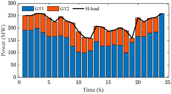 Figure 5 and Figure 6 depict the 24-h scheduling plans for the various generating units in Cases 1 and 2, respectively. To meet the power and heat loads, carbon trading results in increased dispatch volumes and operational costs for the three CPPs are considered. Notably, compared to Case 1, Case 2 incurs higher costs due to carbon taxes and increased solvent degradation costs at CCPPs after accounting for the carbon tax. This ultimately leads to an increase in the overall costs of the IES. Compared to Case 2, Case 3 considers three types of controllable loads; by managing these loads, the grid’s transaction benefits increase by 7.22%, the revenue from the response of the three controllable loads increases by 3.7%, and the frequency of ESS utilization increases, thereby increasing the capacity degradation costs of the ESS. Figure 7 shows the heating plans of the two GTs to meet the thermal load. In comparison to Case 3, Case 4, after considering two types of controllable heat loads, sees a reduction in carbon trading costs of 9.3%, a decrease in solvent loss costs at the carbon capture facility of 7.23%, and a reduction in the overall operational costs of the GTs of 9.97%.