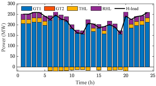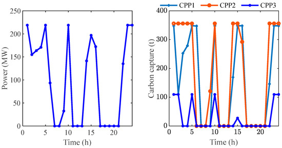 Figure 8 is the dispatch plan of each power generation unit within 24 h in Case 4. Figure 9 illustrates the changes in the original power load after scheduling three types of controllable loads in Case 4. It is evident that the adjusted power load curve becomes smoother. Figure 10 presents the heating balance under various factors in Case 4. By comparing Figure 7 and Figure 10, it is clear that utilizing two types of controllable heat loads results in a relatively smoother overall heat load curve. Additionally, from Figure 10, it is apparent that by adjusting the two controllable heat loads, GT 2 does not produce heat. This not only reduces the overall operational costs of the GTs but also potentially lowers carbon trading costs to some extent. The left graph in Figure 11 shows the energy consumption for carbon capture of CCPPs at different times, and the right graph shows the amount of carbon dioxide captured by the three CPPs at various times.